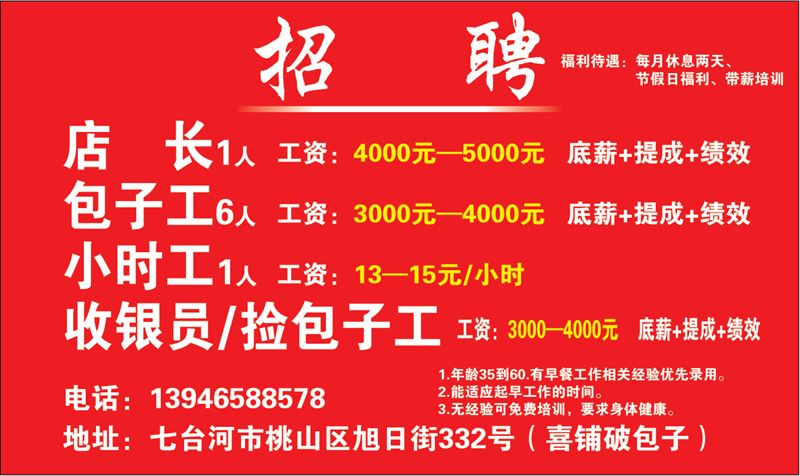 包子鋪招聘 店長(zhǎng)1人(工資:4000元—5000元 底薪+提成+績(jī)效) 包子工6人(工資:3000元—4000元 底薪+提成+績(jī)效) 小時(shí)工 1人(工資:13-15元/小時(shí) ) 收銀員/撿包子工(工資:3000元—4000元 底薪+提成+績(jī)效)