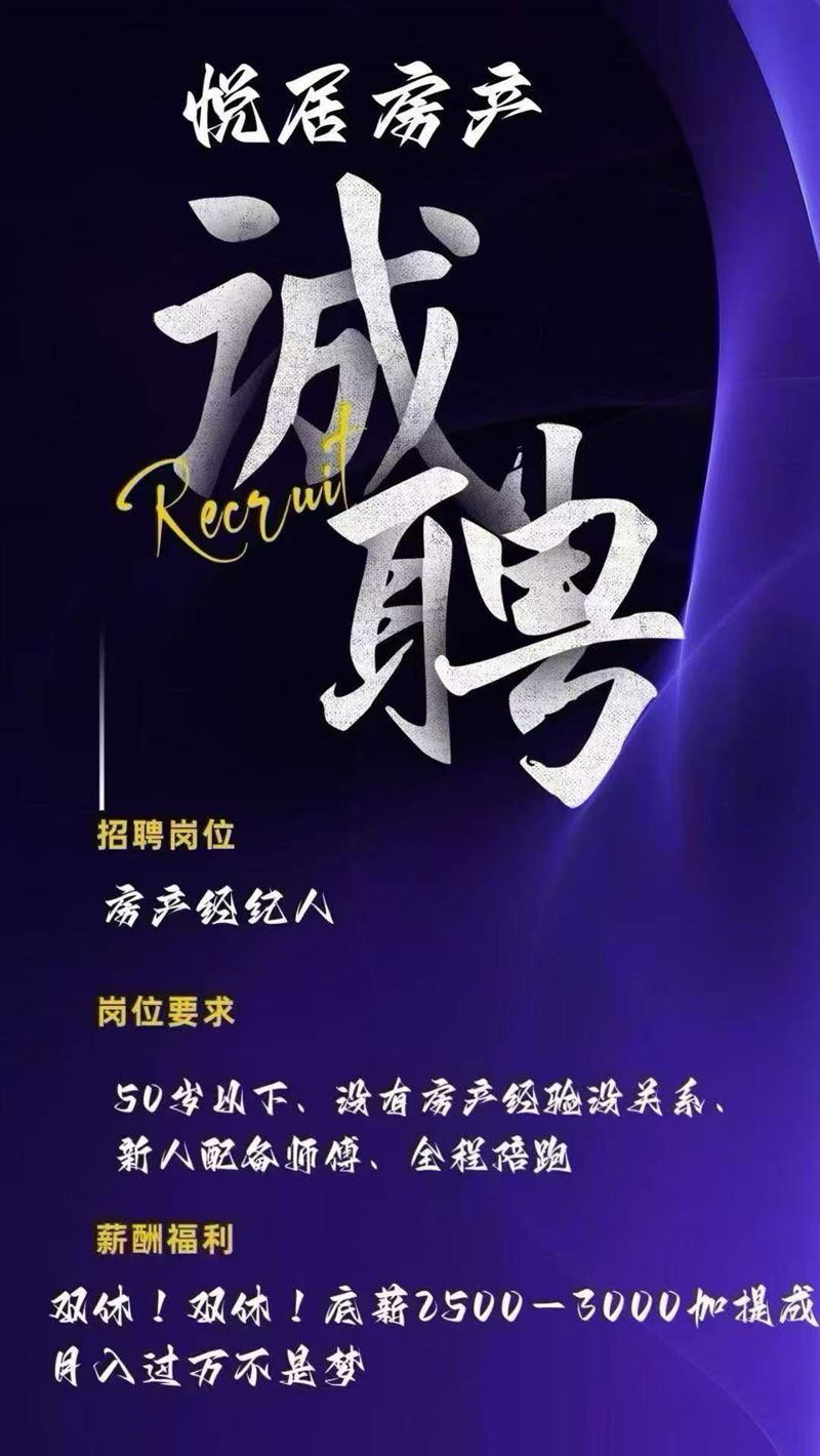 悅居房產(chǎn)招房產(chǎn)經(jīng)紀(jì)人,男女不限,學(xué)歷不限,每月休息8天帶薪假,星期六,星期日,雙休?。。?br />工資底薪+提成,綜合工資7000-15000上不封頂,新人有專人帶,想要月薪過萬你就來,就近分配。